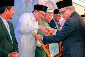 BARRU,SUARABANGSAINDONESIA—Anugerah Penghormatan dan Penghargaan dari Pengurus Besar Darud Da’wah Wal Irsyad (DDI) diterima oleh Bupati Barru Ir. H. Suardi Saleh,M.Si diatas panggung kehormatan pada peringatan