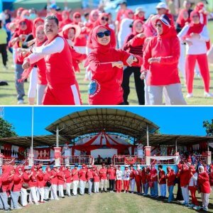 BARRU,SUARABANGSAINDONESIA—Plt. Ketua TP PKK Kabupaten Barru drg.Hj.Ulfah Nurul Huda Suardi, MARS mengikuti Senam Massal Merah Putih Tingkat Kecamatan Tanete Rilau di Lapangan Sepak Bola Andi