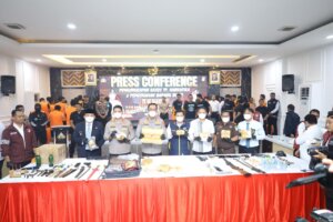 MAKASSAR—Kapolda Sulawesi Selatan Irjen Pol. Djuhandhani Rahardjo Puro, S.H., M.H., memimpin Press Conference Pengungkapan Kasus Narkotika dan Penculikan Anak di Bawah Umur, yang digelar di