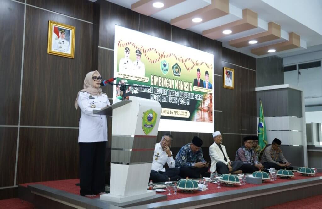 BARRU,SUARABANGSAINDONESIA—Bupati Barru Andi Ina Kartik Sari. SH., M.Si membuka secara resmi Bimbingan Manasik Haji Reguler Terpadu Tingkat Kabupaten Barru Musim Haji Tahun 1446 H / 2025 M di Baruga Singkeru’ Adae Rumah Jabatan Bupati Barru, Rabu (09/04/2025)