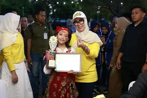 Dengan penuh percaya diri, ia melangkah di atas panggung. Balutan kostum perjuangan yang dikenakannya bukan sekadar hiasan, tetapi seolah menjadi perwujudan semangat kepahlawanan yang hidup di dalam dirinya.
