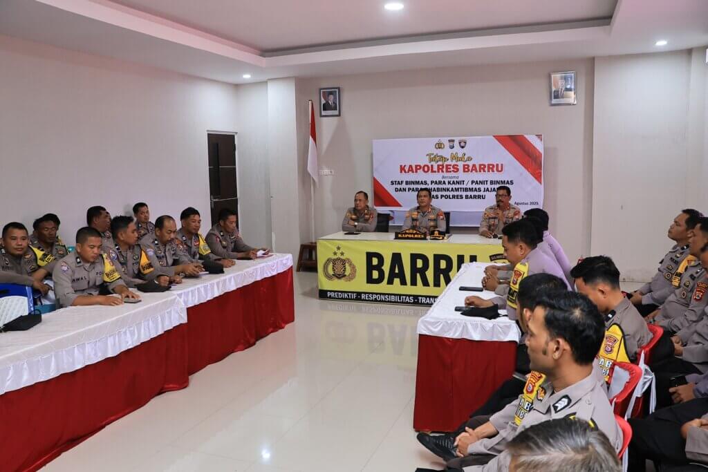 Di Aula Polres Barru, Kapolres menyampaikan bahwa Bhabinkamtibmas mengemban peran krusial dalam menyukseskan program prioritas seperti Makan Bergizi Gratis, Sekolah Rakyat, Koperasi Merah Putih, hingga Stabilisasi Pasokan dan Harga Pangan.