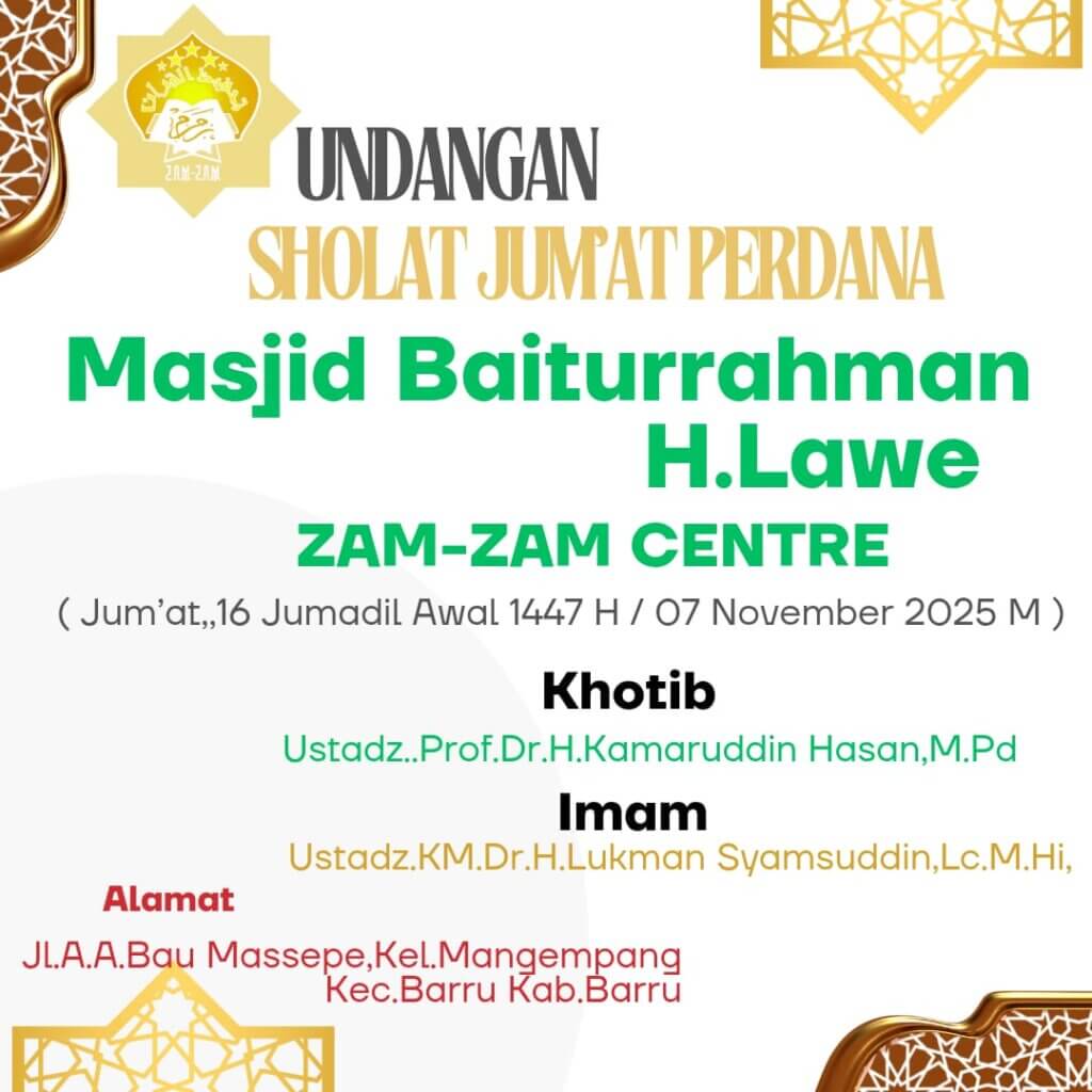 BARRU, – Masjid Baiturrahman H. Lawe yang terletak di Kompleks ZAM-ZAM CENTRE, Jl. A.A. Bau Massepe, Kelurahan Mangempang, Kecamatan Barru, Kabupaten Barru, akan menyelenggarakan ibadah Sholat Jumat Perdana pada hari Jumat, 07 November 2025 M (bertepatan dengan 16 Jumadil Awal 1447 H).