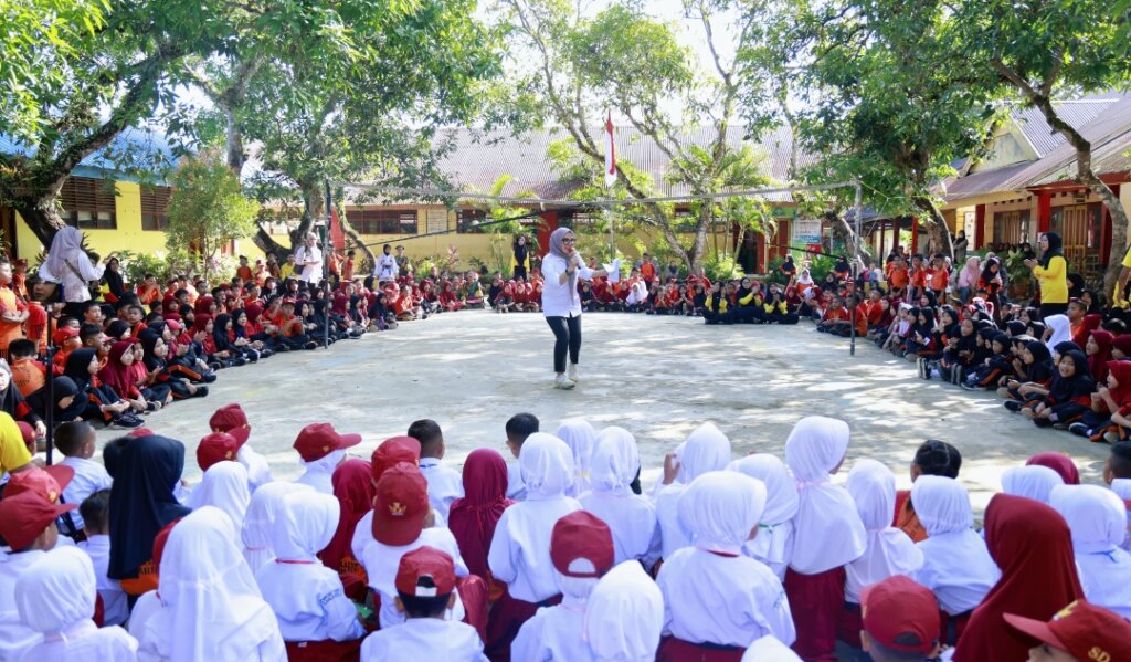 Dengan gaya komunikatif dan penuh semangat, Ia mengingatkan para anak-anak siswa pentingnya sarapan sebelum berangkat ke sekolah, agar siap mengikuti pelajaran dengan tubuh yang kuat dan pikiran yang segar.