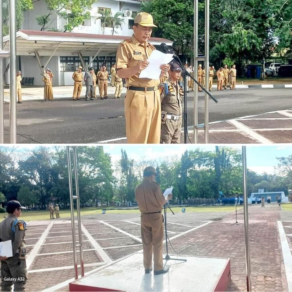 Anshar Tahir di podium inspektur upacara menyampaikan beberapa hal dihadapan sejumlah peserta upacara diantaranya termasuk tugas dan fungsi Kesbangpol dan yang menjadi prioritas yaitu melakukan pemantauan terhadap proses pilkada tahun 2024.