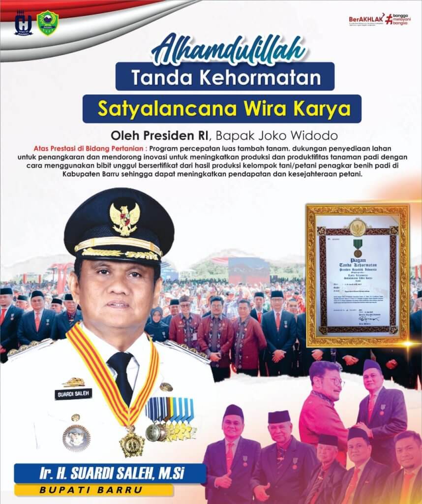 Penganugerahan Tanda Kehormatan Satyalancana Wira Karya kepada Bupati Barru Suardi Saleh tidak terlepas dari keberhasilan dalam mengelola dan memimpin pelaksanaan pembangunan.