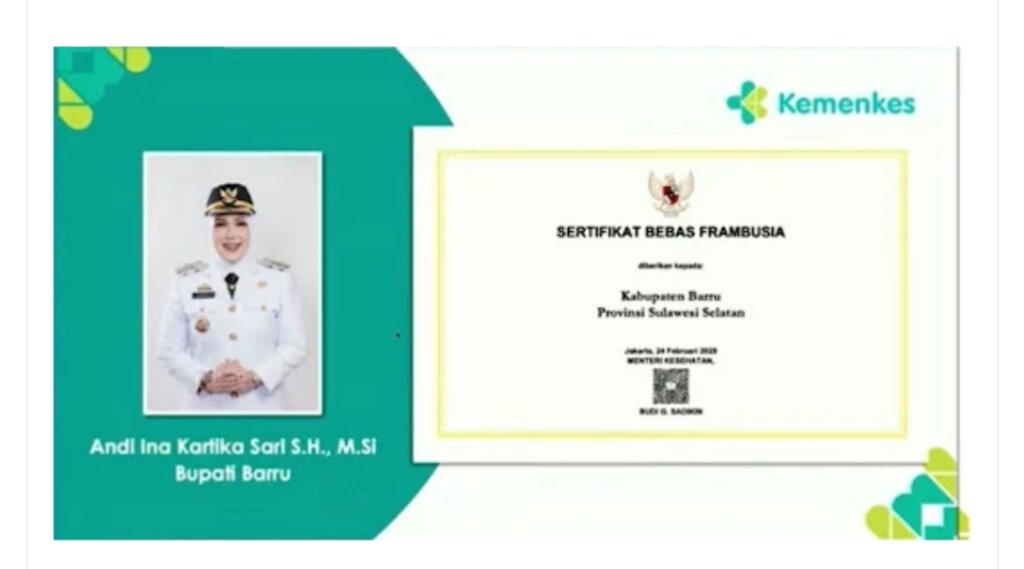 Sertifikat ini diserahkan sebagai bentuk pengakuan atas keberhasilan Barru dalam menekan dan mengeliminasi penyakit frambusia di wilayahnya.